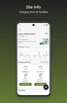 - Details Site Info Screen: You can view detailed information about charging stations, including location, Availability, Amenities, Pricing, Opening times and more.