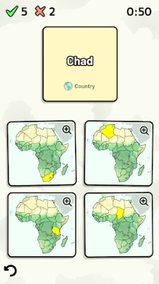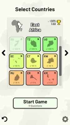 Customizable quizzes allow you to choose which African countries to test, as well as the topic. Past results for each African country are displayed to highlight your progress at each topic. Standard quizzes allow you to learn each topic by progressing through a series of levels, each covering additional countries.