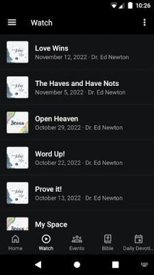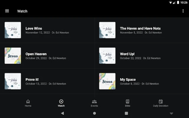 - Watch or listen to past messages - Follow along with our Bible reading plan - Learn more about events, trips, and tours - Read our daily devotion blog posts - Stay up to date with push notifications - Share your favorite messages via Twitter, Facebook, or email - Download messages for offline listening