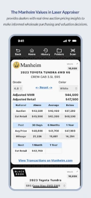 Starting at $49 per month, Laser Appraiser VIN Scanner is built for automotive professionals, providing instant access to industry-leading valuation data. Scan a VIN and unlock wholesale, retail, and trade-in values from J.D. Power (NADA), Black Book, Kelley Blue Book, Galves, Manheim Market Report (MMR), and more. Plus, get free integrated CARFAX™ and Experian AutoCheck history reports. Whether on the lot or at auction, VIN Scanner delivers fast and accurate VIN barcode scanning, manual VIN entry, and vehicle searches by Year, Make, and Model.